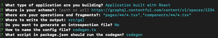 npx graphql-codegen initIt should ask some questions so it can generate the file codegen.ts