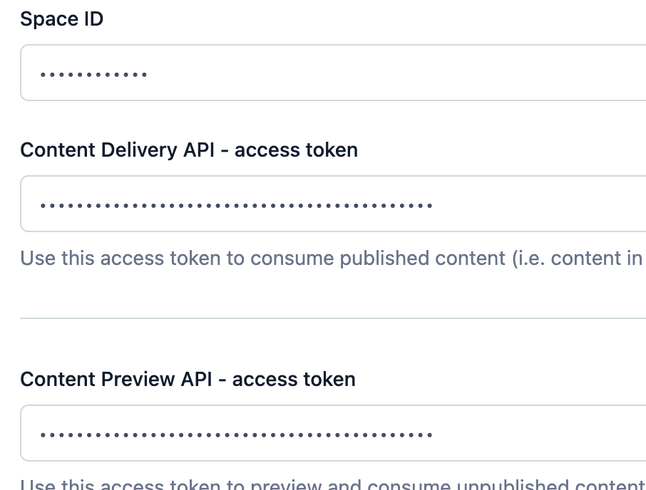 Copy the SpaceId, the Content Delivery Access Token and the Content Preview Token
