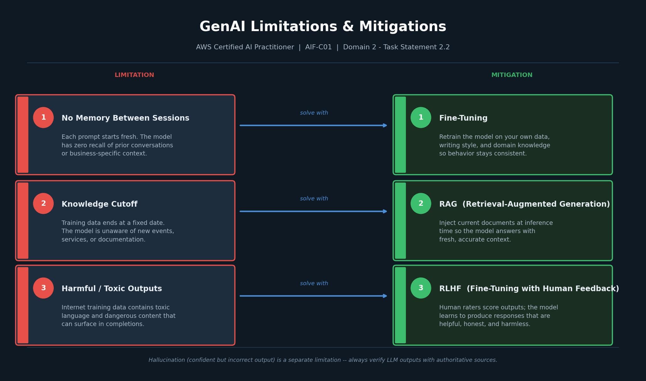 Generative AI is powerful, but it works best when you understand its edges. The advantages are real: adaptability across tasks, natural language output, and lower cost to build. The limitations are also real: no memory, a knowledge cutoff, potential for harmful outputs, and hallucinations. Each limitation has a known solution (fine-tuning, RAG, RLHF), and knowing which solution fits which problem is what the AIF-C01 exam tests.
