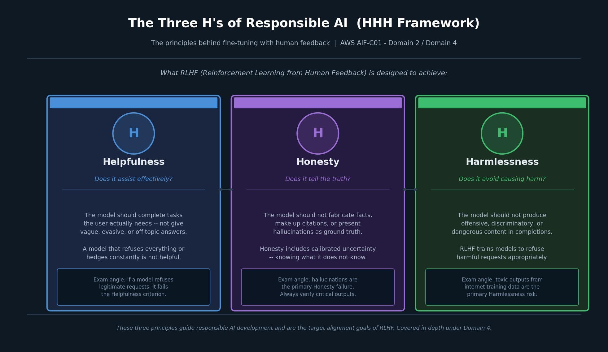 These three principles are the responsible AI framework you will encounter throughout the AWS AI Practitioner exam, particularly in Domain 4. They are introduced here because they are also the design goals behind fine-tuning decisions.