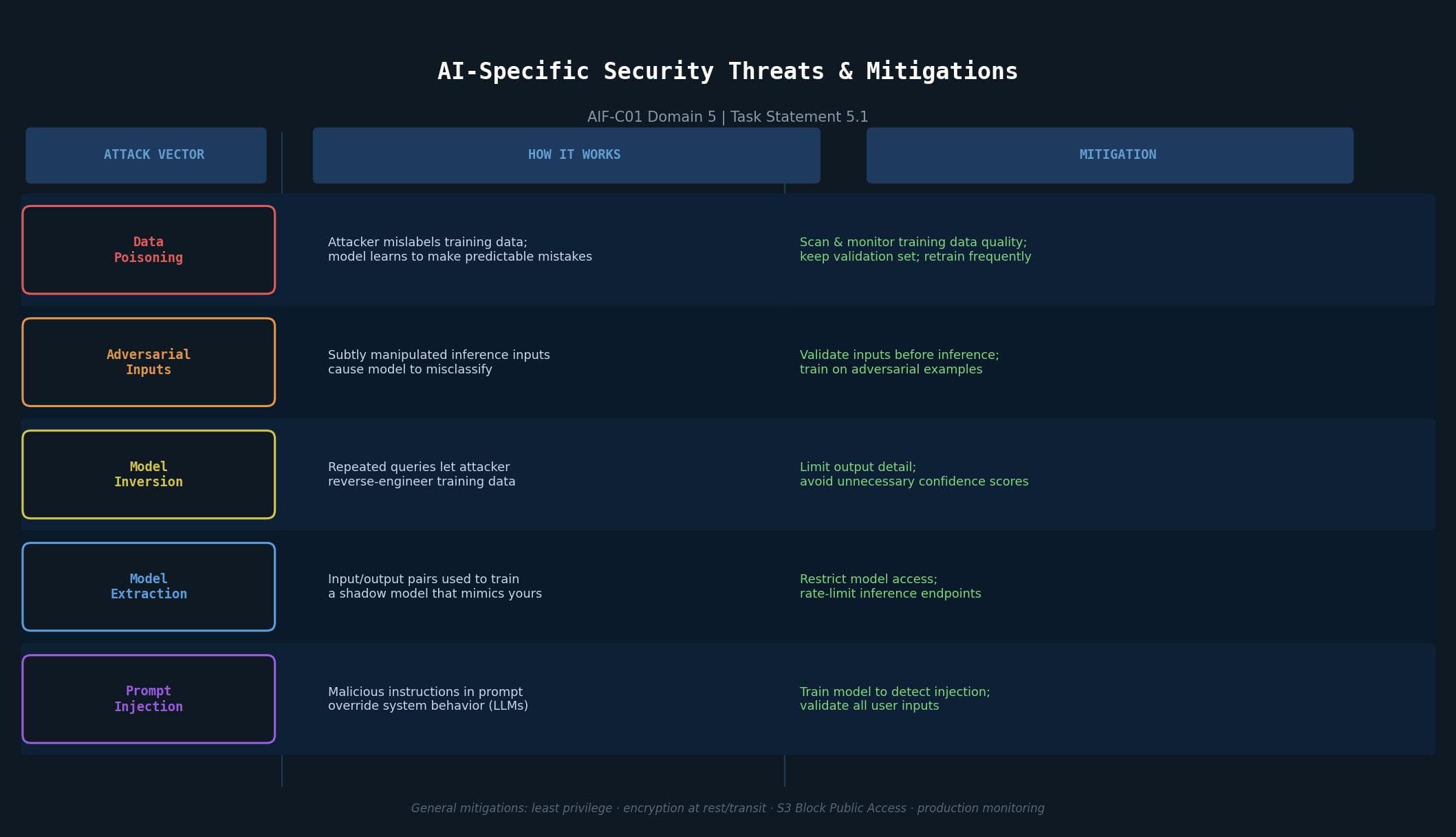 Cross-cutting mitigations: least privilege, encryption at rest and in transit, S3 Block Public Access, production monitoring.