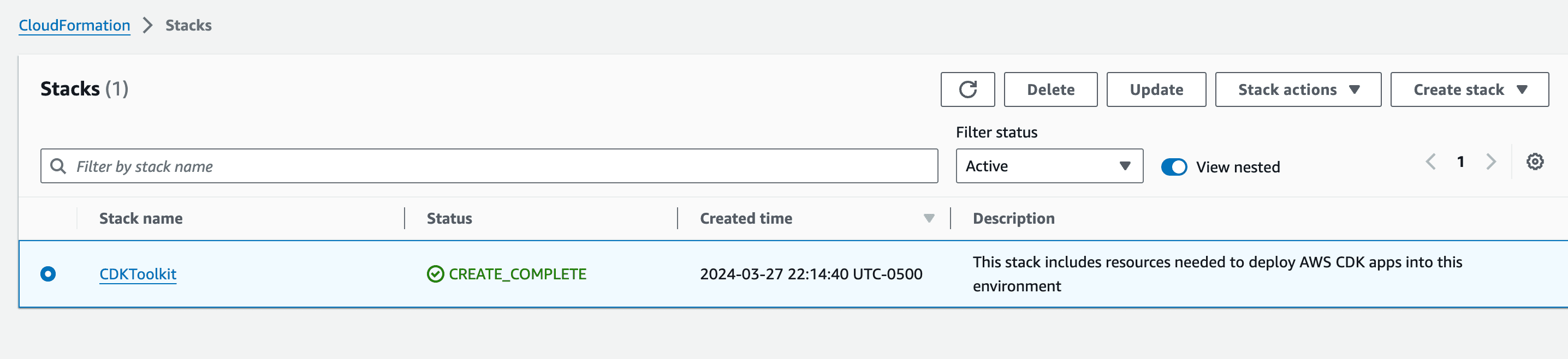 After completing these steps, rerun the cdk bootstrap command. Successful execution indicates your AWS account and region are now ready to deploy AWS CDK applications, visible by the new CDKToolkit stack in the CloudFormation service.